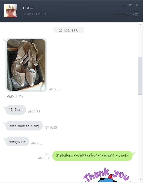 ขอบคุณสำหรับรีวิวนะคะ รับส่วนลดในการสั่งซื้อสินค้าครั้งต่อไป 5% ไปเลยจ้า ^_^
